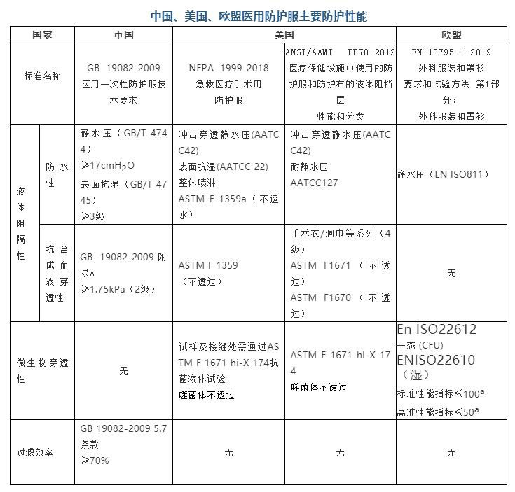 防護(hù)服的“防護(hù)性能”是最為重要的性能要求,主要包括液體阻隔、微生物阻隔和對(duì)顆粒物質(zhì)的阻隔等方面。目前國(guó)際上較通用的醫(yī)用防護(hù)服標(biāo)準(zhǔn)是美國(guó)NIOSH(美國(guó)國(guó)家職業(yè)安全衛(wèi)生研究所)標(biāo)準(zhǔn)和歐盟的EN標(biāo)準(zhǔn)。下面就主要國(guó)家醫(yī)用防護(hù)服標(biāo)準(zhǔn)中的防護(hù)性能進(jìn)行簡(jiǎn)單比對(duì)。