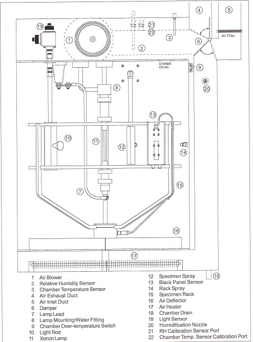 ? 約50%的氙燈熱量通過(guò)頂部管道排向儀器周?chē)目諝庵小?br /> ? 試驗(yàn)箱內(nèi)的廢熱也通過(guò)儀器的頂部排氣管道排出。