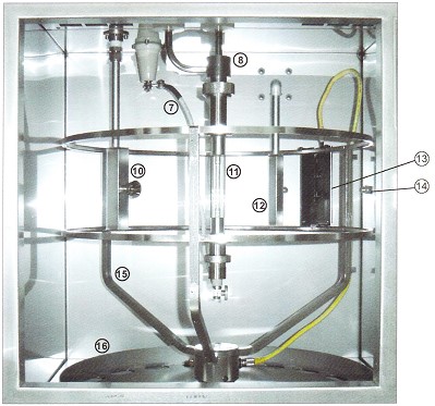 (15)空氣偏導(dǎo)器:空氣偏導(dǎo)器為不銹鋼圓環(huán)。空氣通過(guò)試驗(yàn)箱地板排氣孔向動(dòng),越過(guò)空氣偏導(dǎo)器,空氣偏導(dǎo)器引導(dǎo)氣流從試樣架上的試樣過(guò)。