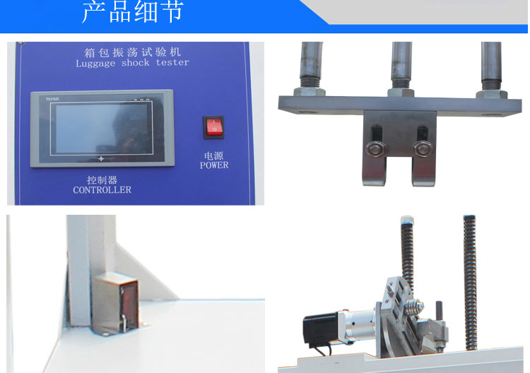 本機臺用于測試旅行箱提把、車縫線及整體結構的耐震蕩沖擊試驗.方法是在對象上裝載規(guī)定的荷重,以每分鐘30次的速度沖擊及4英寸的沖程對試件做2500次試驗,試驗結果可作為質量改進的參考.