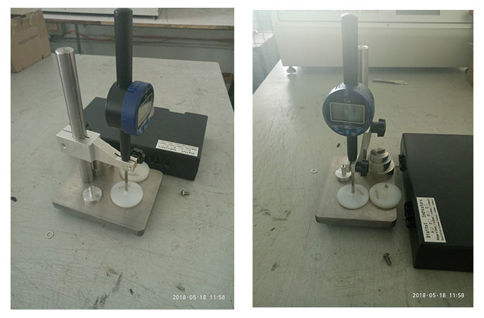 將試樣放置在基準(zhǔn)版上,用壓腳對(duì)試樣施加壓力,測(cè)量接觸試樣的壓腳面積與基準(zhǔn)板之間的距離,即為厚度值。